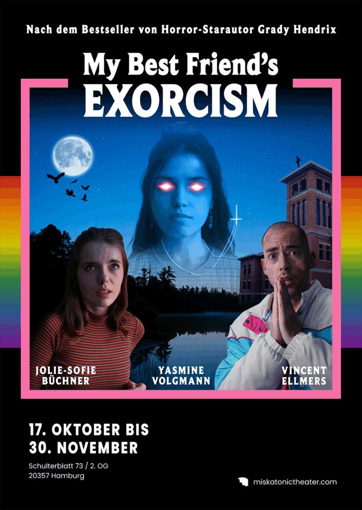 Die einzige, offizielle Bühnenadaption von Grady Hendrix Welt-Bestseller MY BEST FRIENDS EXORCISM! Wir bringen einen der größten Kulte der modernen Horror-Literatur erstmals auf die Bühne! High School, 1980er Jahre: Abby und Gretchen sind beste Freundinnen – bis ein Dämon die Freundschaft sprengt. „My Best Friend’s Exorcism“ verbindet bissige Horror-Komödie mit einer berührenden Coming-of-Age-Story über Freundschaft, Pubertät und das Übernatürliche.