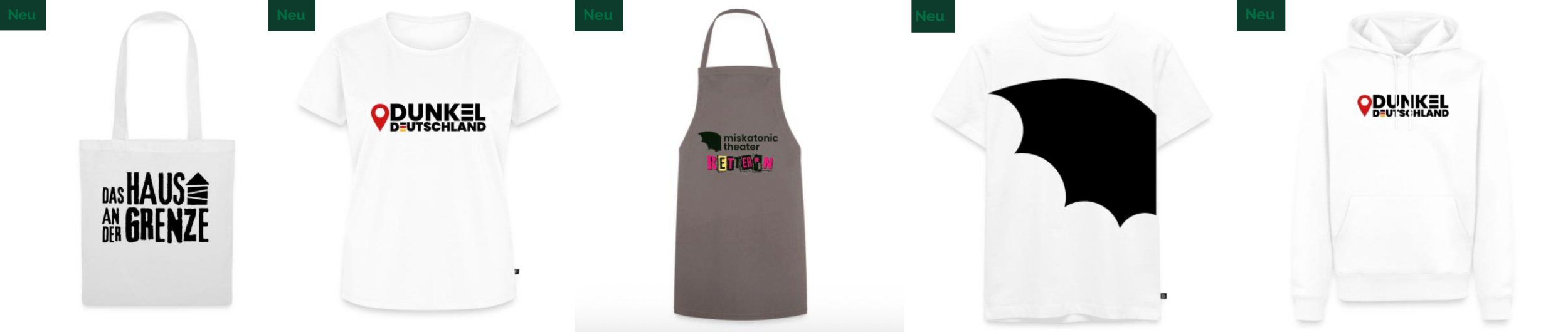 Dort bekommt ihr Dunkeldeutschland-, Haus an der Grenze-, Miskatonic Retter*in- und antikyno-Merch.